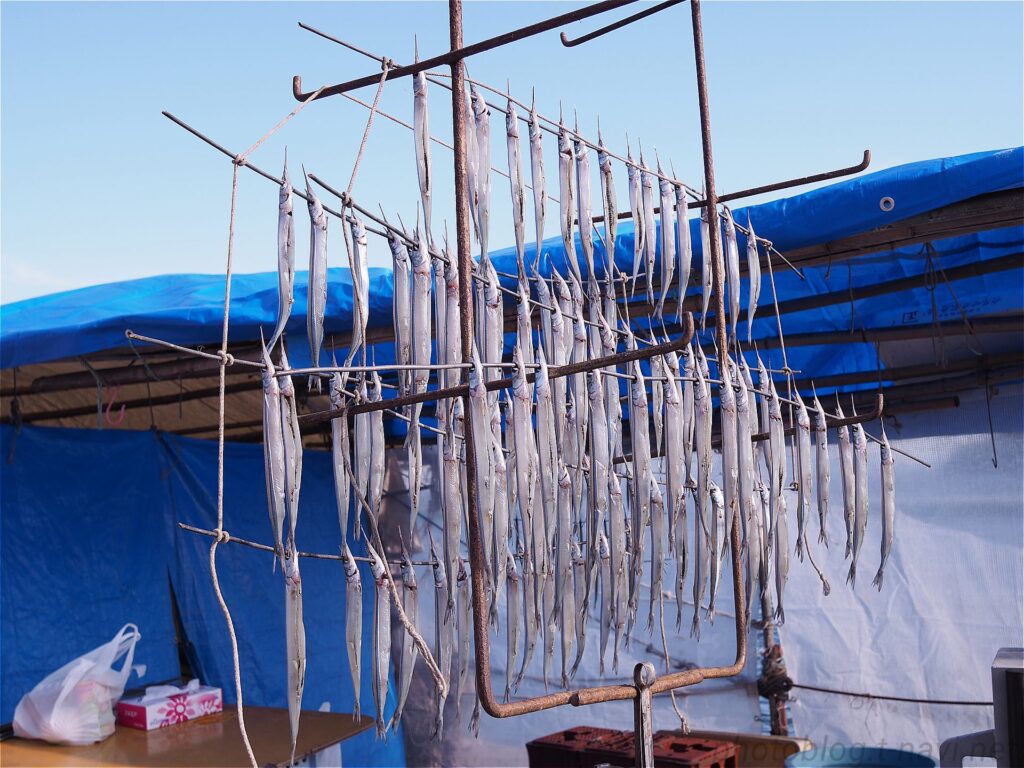 干されはじめの身は半透明。寒風に吹かれて乾いていくと旨味が凝縮されて銀色に変わっていきます。