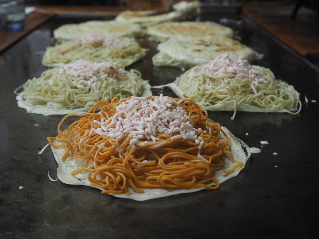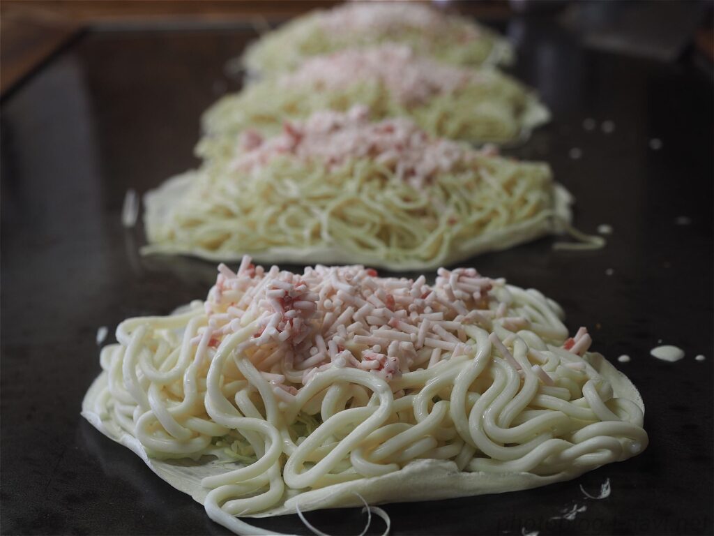 生地、キャベツ、そば、ミンチ肉の順に重ねて焼かれていきます。