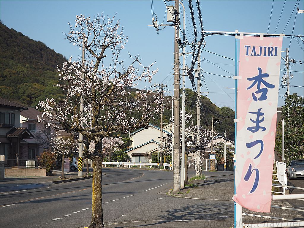 道路沿いに杏まつりののぼりが立っています。